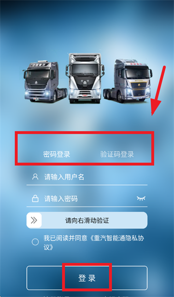 在登录界面可以选择密码登录和验证码登录,输入信息,勾选我已阅读并同意重汽智能通隐私协议,点击登录即可