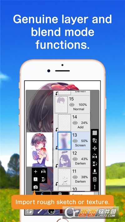 G笔,笔,数码笔,气刷,圆刷,平刷,铅笔,油画颜料,木炭,蜡笔,邮票等超过12,000种画笔图案