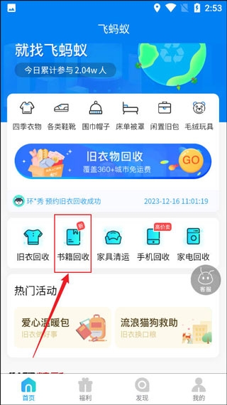 一、首先打开飞蚂蚁app,点击首页中的旧衣物回收。