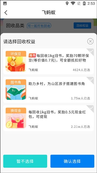 用户可以在飞蚂蚁平台在线预约,免费上门回收旧衣物。回收完成后会奖励相应的环保豆、优惠券以及环保证书。