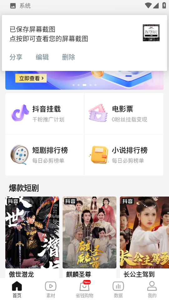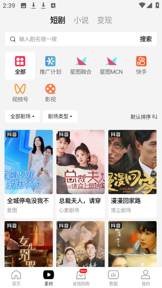 4、点击下方的“素材”,可以看到各种丰富的短剧素材内容。