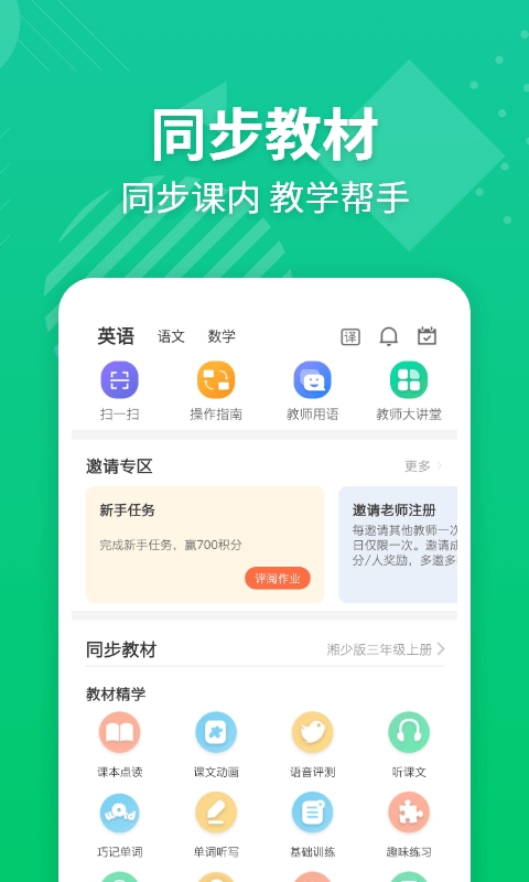 免费下载 大小:241.00 MB 下载:1次 E英语宝老师 V5.7.9 支 持:安卓 分 类:安卓软件 大 小:241.00 MB 版本号:v5.7.9 发 布:2025-06-27 17:32:04 手机扫码免费下载 #E英语宝老师 V5.7.9简介 E英语宝老师是一款专为小学英语教师设计的教学辅助工具,同步湘少版、湘鲁版、人教版等主流教材,提供丰富的教学资源和全流程的教学支持。实时在线推荐听力、口语、绘本等多种练习形式,满足不同教学需求。通过大数据分析,系统展示学生练习情况,助力教师高效教学。提供正版课本点读、高清课文动画和精致单词卡片,方便教学包含专题教研、专家讲座、口语训练等内容,助力教师自我提升。 #E英语宝老师 V5.7.9截图