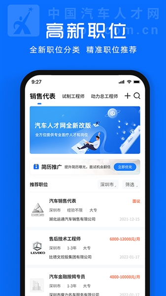 中国汽车人才网是一款汽车行业求职招聘平台,这里有汽车设计、制造、销售还是售后服务等领域的职位,用户可以轻松创建并更新个人简历,快速投递感兴趣的岗位,并且能够根据地理位置筛选附近的招聘信息,助用户找到满意的工作,开启职业生涯的新篇章。