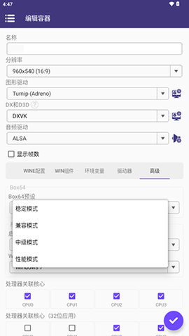 如果您遇到性能问题,请尝试将 Box64预设更改为容器设置 ->高级选项卡。Performance