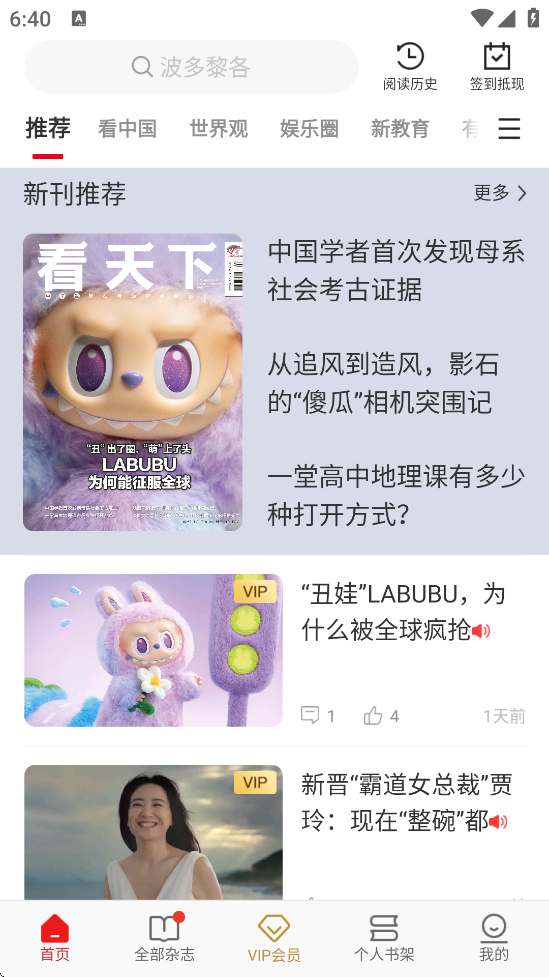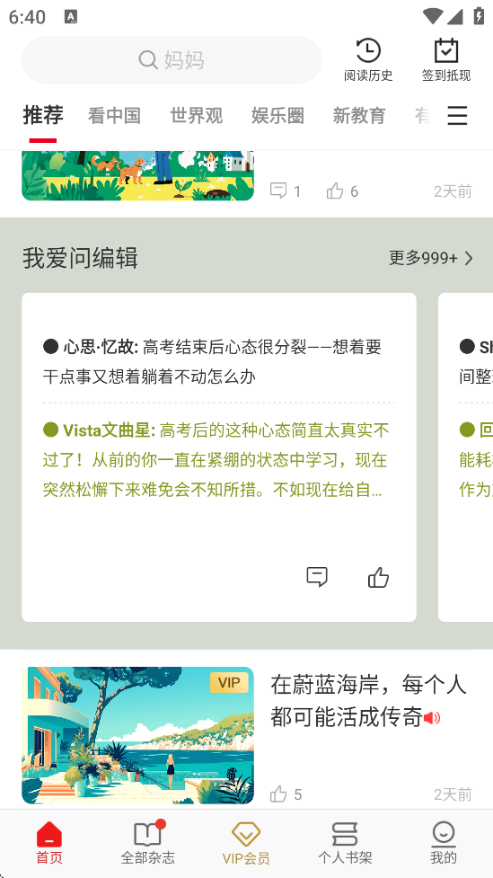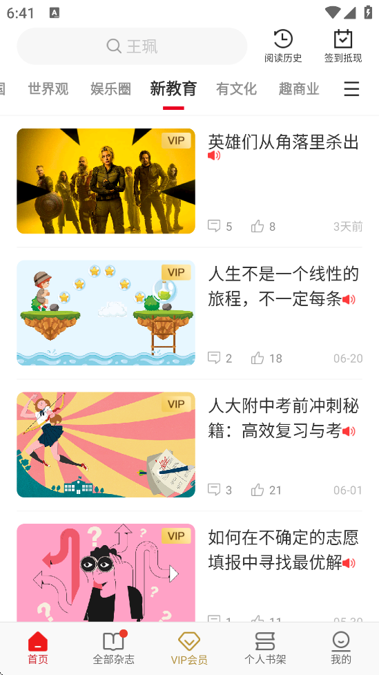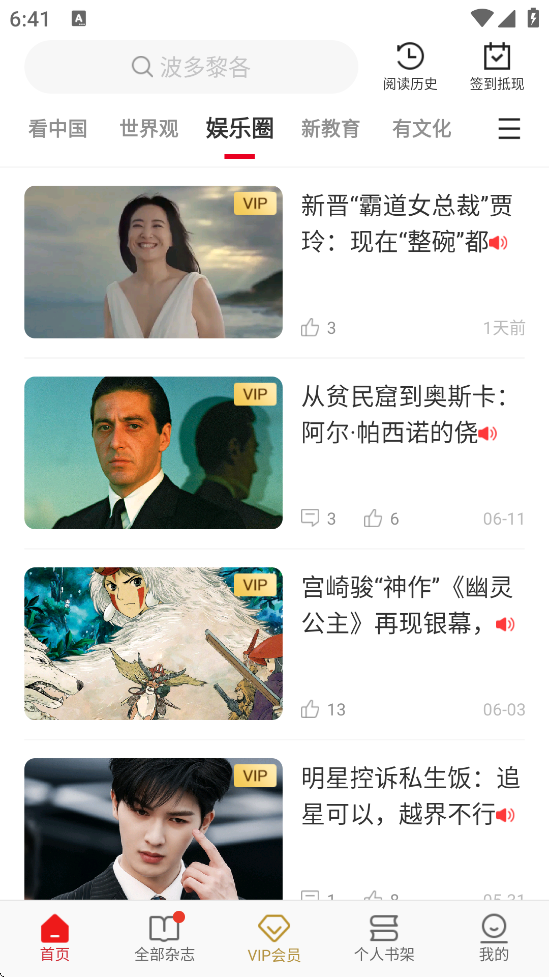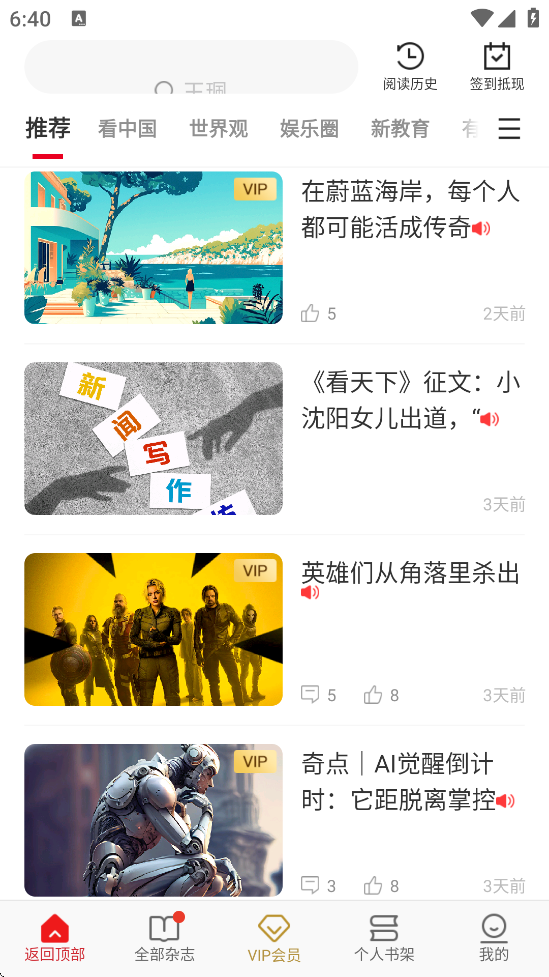 1、会员服务:VIP用户可解锁AI语音朗读、全库杂志畅读及专属电子书(Vbook)权益,非会员可通过阅读积分兑换内容。