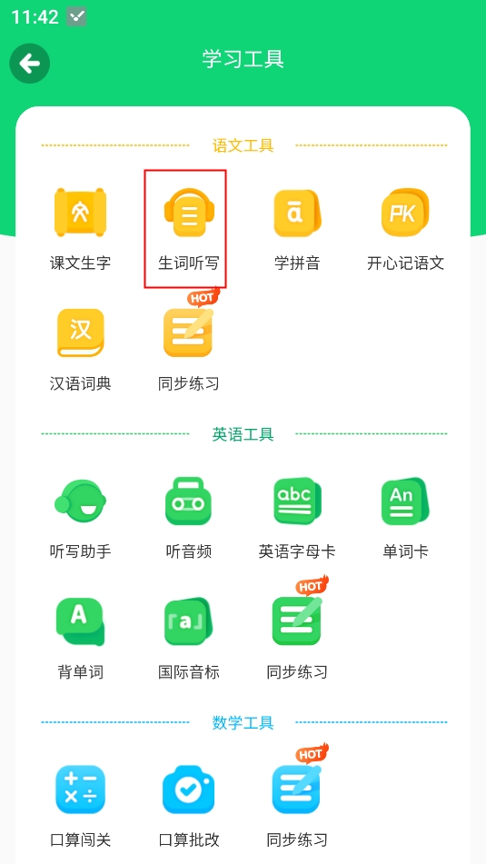 2、进入到学习工具页面,点击“生词听写”选项;