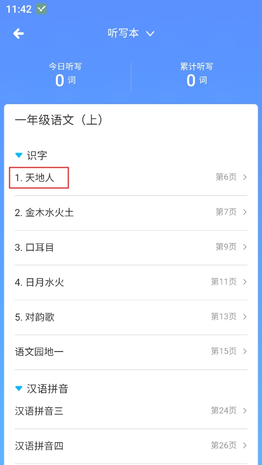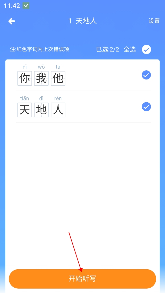 3、选择想要听写的生词并点击进入;