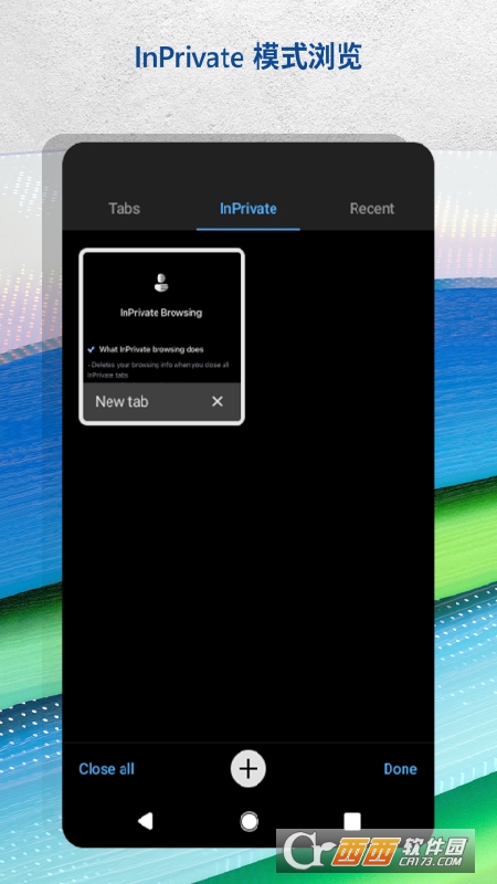 InPrivate:使用InPrivate模式浏览后,电脑上将不会保存浏览数据(例如历史记录、临时Internet文件和Cookie)。