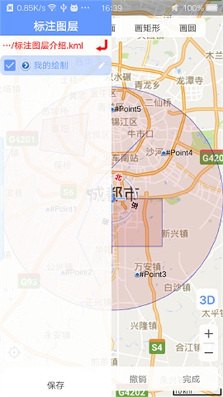2、在抽屉的底部有一个保存按钮,点击将保存当前选中的kml对象