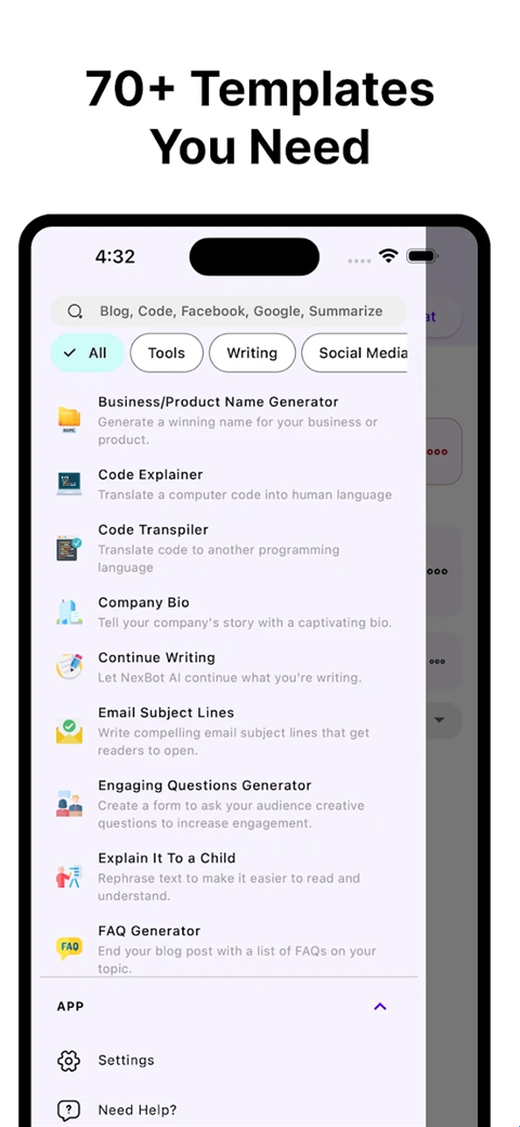 4、进入主界面后,用户会发现NexBot提供了多种实用功能,包括电子邮件生成器和段落生成器等。