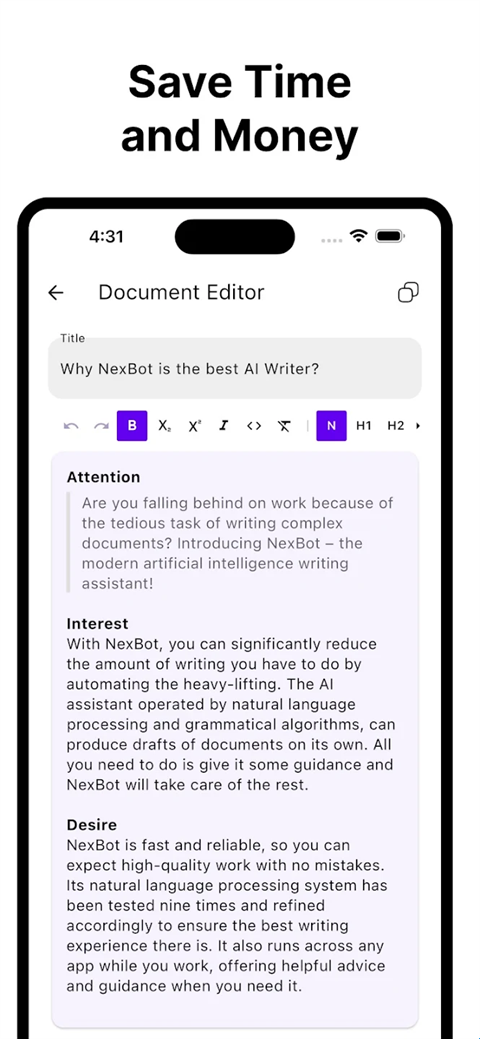 人工智能作家助手NexBot是一款专业的AI写作助手,用户可以使用它编辑文案创作、生成文章、故事等等,为你提供多个不同的模板,让你在线创作更加轻松。同时你可以注入关键词和短语,AI一键帮你生成,为你的创作添彩。