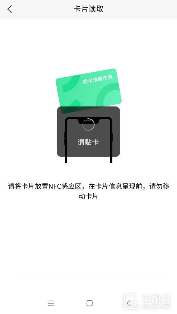 3、具备NFC功能的安卓系统手机,打开哈尔滨城市通APP,点击“卡片充值”按钮,选择“卡片NFC充值”选项(不具备NFC功能手机不显示此选项),将卡片贴在手机背面NFC感应区,选择充值金额及支付方式后,即可完成在线充值
