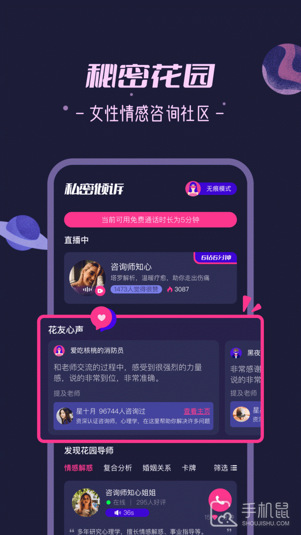 很多人的情感比较充沛,如果没有倾诉对象,一直挤压在心中,那么就有可能造成不好的后果。秘密花园APP是专为女性用户提供情感、烦恼在线资讯以及匿名倾诉的社交平台,主打无痕资讯,不保留任何记录,聊天之后即刻销毁,可以安心诉说内心的心事,同时还有许多匿名好友可以给出各种建议,在这里可以找到各种各样不同的人来帮助你解决生活中的各种烦恼,释放生活压力。用户可以把秘密花园APP当成一个树洞,诉说自己的内心真实情感。