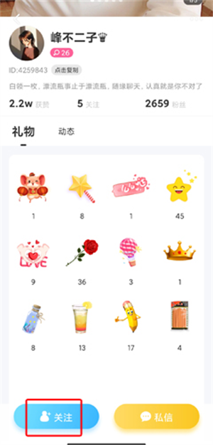2、进入用户页面,点击关注按钮,对方若是回关的话就可以成为好友了。