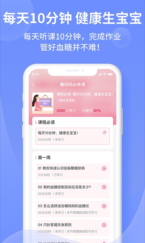 1、权威课程:国内首个针对糖妈妈的标准课程,由国内顶级内分泌及妇产科专家联合编制。只需每天听课10分钟,完成课后作业,助您生下健康的宝宝。