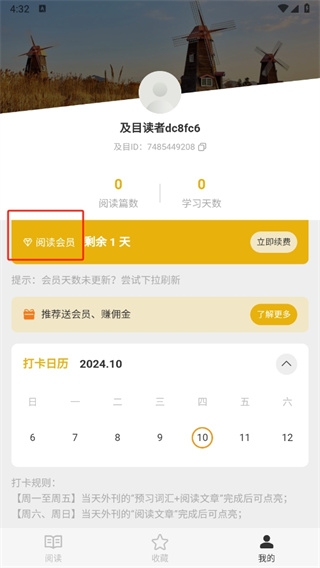2、然后在我的页面中需要点击阅读会员后面的【立即续费】;