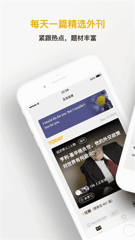 及目阅读是一款英语外刊精读的软件,涵盖经济、文化、社会、科技等多样题材,有中英对照、英美音频、重点词汇、长难句分析、相关视频、口语测评等功能,帮助提升用户的英语听说读写能力。