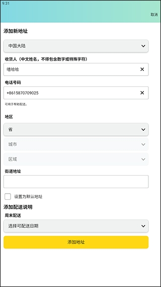 5、然后输入自己的收货地址详细信息和联系方式,然后点击添加地址,在后续购物中就可以使用新的地址。