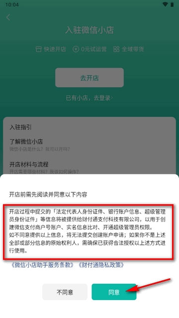 5、请仔细了解微信和小店,和准备开店材料与流程,再点同意。