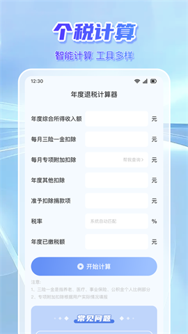 3、您可以计算个税信息、计算税后收入与房贷利息,了解退税知识及常见问题,快速掌握纳税要点。