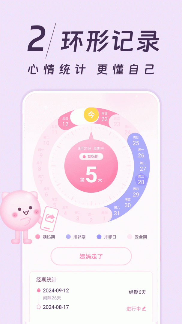 3、姨妈记贴心根据你的记录测算经期、排卵期,让你从容应对,不再措手不及
