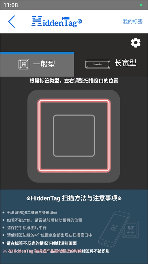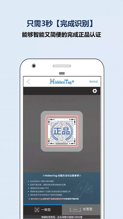2、进入到扫描标签页面,将摄像头对准产品的中心镭射标进行扫码,使标签边缘的4个位置点全部出现在扫描窗口中,扫描成功后即可验证(在HiddenTag破损或产品疑似假货的时候标签将不被识别)