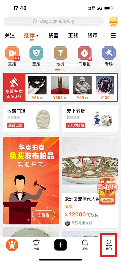 1、打开华夏收藏app,来到用户首页,点击下方的“我的”按钮;