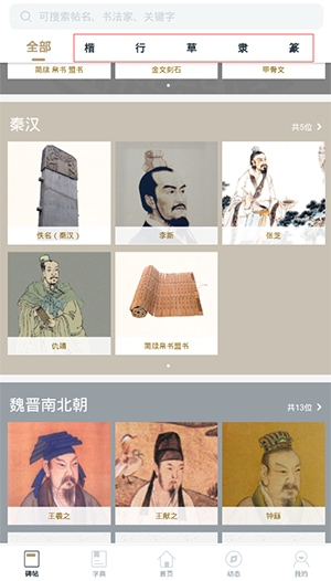 2、点开碑帖,可以发现各种字体以及各个朝代的书法大家。