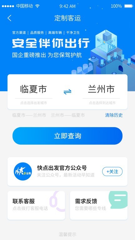 2、轻松在线预订出行车辆,能够结合班次的信息,在线立即预订出行;