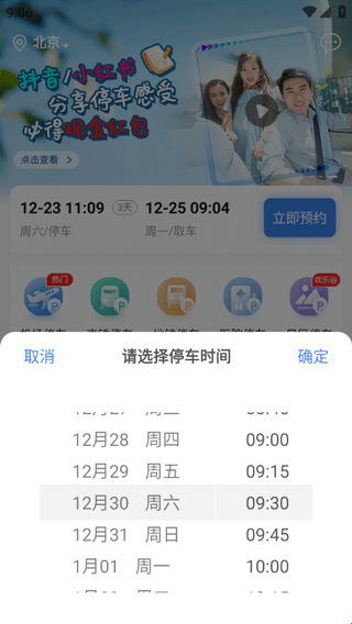 2、接下来点击选择停车和取车时间后点击立即预约。