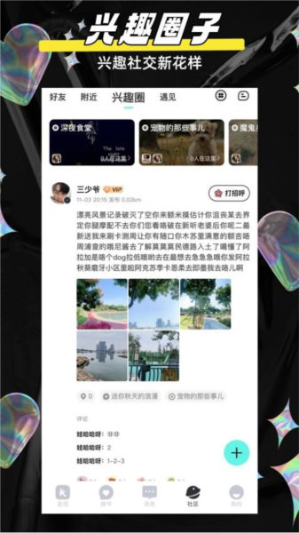 1、实时更新的社交体验: 附近在线列表、推荐内容和话题始终保持新鲜,确保您不会错过任何一次机会。