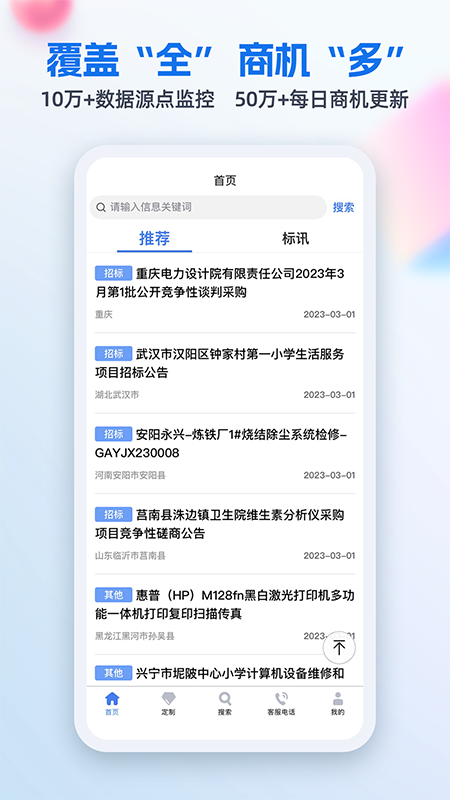 全:招投标采购信息覆盖全国95%以上政府采购及招标网企业招标平台,每日新增招标采购信息50000条以上, 超过1000万用户在这里寻找商机