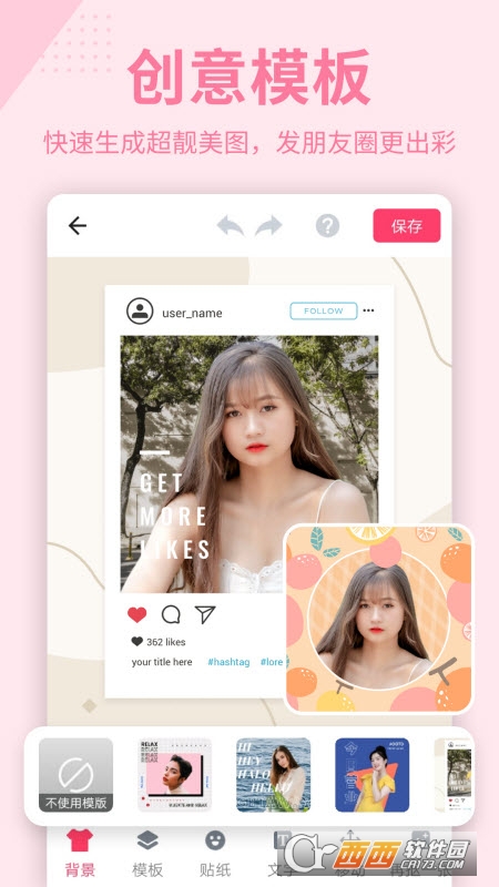 保存及分享:保存合成的图片到手机相册或分享到任意APP, 非常方便。