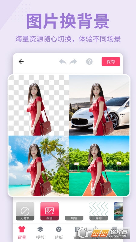 导入背景图片合成:内置20种精美背景图库,让你的抠图丰富多彩,你可以通过拍照或选取相册图片自定义添加背景图片