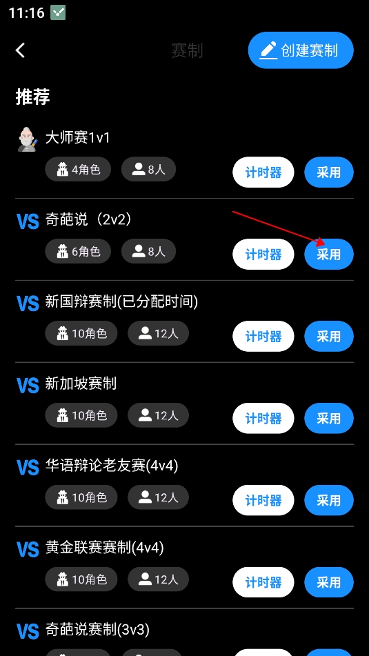 2、进入到赛制推荐页面,在此页面选择一个想玩的赛制点击“采用”按钮,当然也可以点击右上角的创建赛制按钮来自定义赛制;
