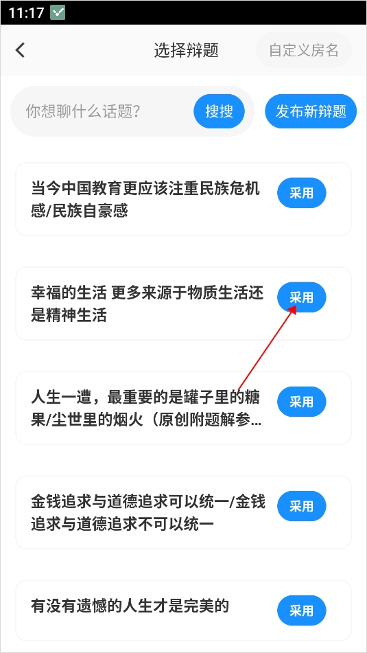 3、之后来到选择辩题页面,该页面也会为你推荐热门的辩题,可以直接点击采用,也可以自定义;