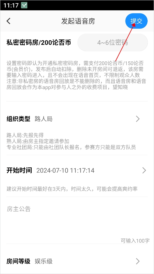 4、之后进入到发布语音房页面,设置好相关信息之后点击右上角的“提交”按钮;