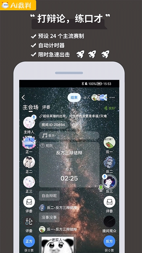 5、擂台比赛:精彩的辩论擂台比赛,报名参加比赛,尽情的与好友线上辩论;