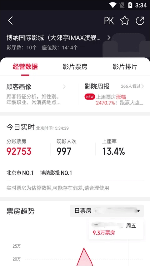 3、进入其中一个影院,我们可以看到经营数据、影片票房、影片排片等等数据分析。