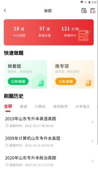 2、点击做题既可以进入做题页面,可以看到今日刷题数量和时长,以及刷题历史等。