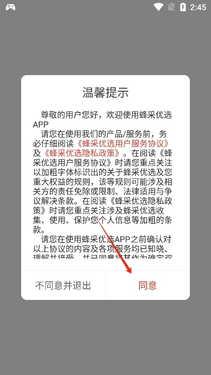 2、进入后阅读并同意蜂采优选app的用户协议
