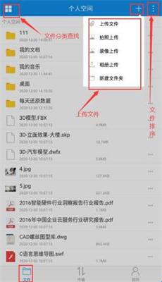 1、打开app,在文件页面左上角可以对文件进行分类操作(收藏夹、个人空间以及企业网盘);点击上方"+"可以上传文件;点击右上角可以对文件进行排序操作