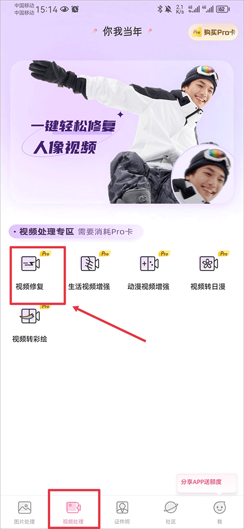 2、然后在相册中选择要修复的视频,在下方拖动边框可以截取视频片段,并使用pro卡进行修复即可
