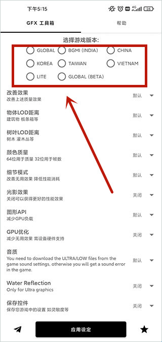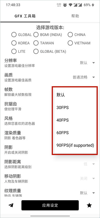 5、此外在GFX工具箱内还可以设置抗锯齿、阴影、纹理等多种数据修改,在设置完成后,点击底部“应用设定”既可开始体验啦。