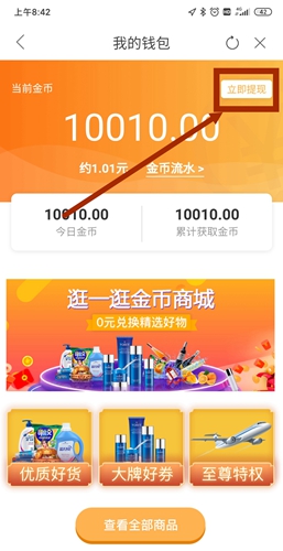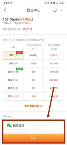 金币兑现金的比例是10000金币=1块,我们点击下方的微信,绑定完微信后就能直接提现到微信了。