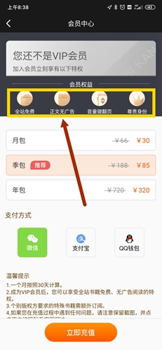 其实很简单啦,我们只需要办一个VIP会员,我们就能够享受到免广告的服务啦,并且VIP会员还能享受到全站小说免费阅读的服务,并且支持音量键翻页,操作是方便了不少的,就是30块一个月有点小贵,具体还是看用户们自己的意愿了。