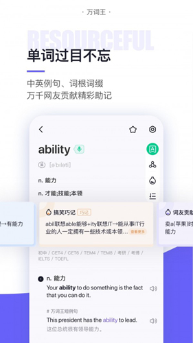 2、免费柯林斯词典,中英例句,词根词缀,更有万千网友分享精彩助记。