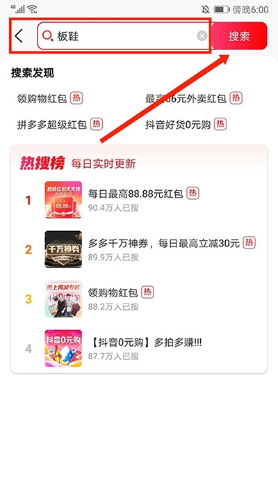 2、在搜索框输入需要的商品,然后选择“搜索”选项,这里以“板鞋”为例;