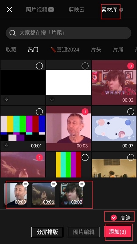 2.然后导入自己所需自己的视频素材,没有素材的可以在“素材库”搜索自己所需的素材(强烈推荐)