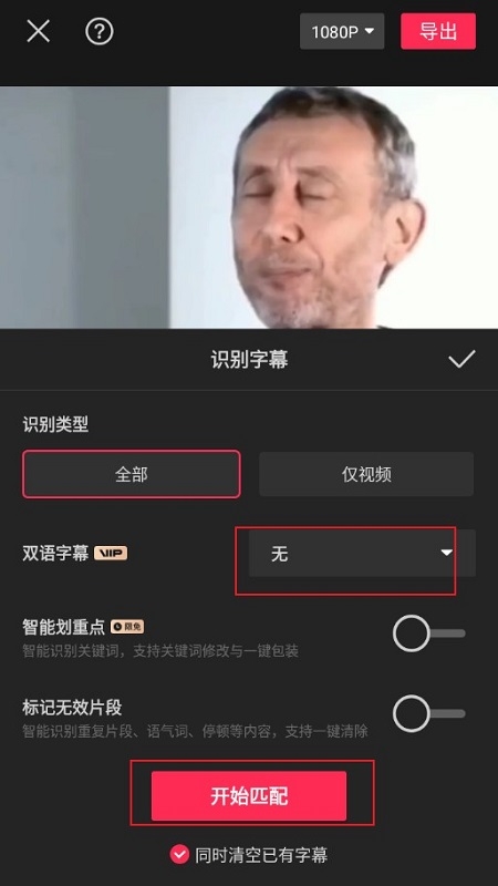 4.在识别字幕编辑页面中,你可以选择识别类型,这里有双语字幕、智能划重点、标记无效片段等几个选项,根据自己的需求灵活进行选择,然后点击“开始匹配”按钮